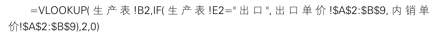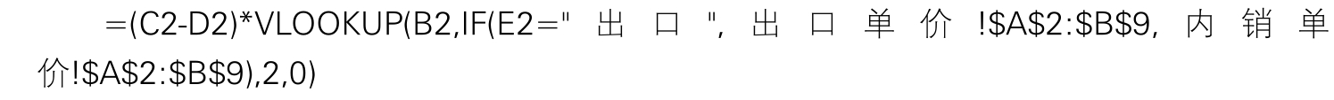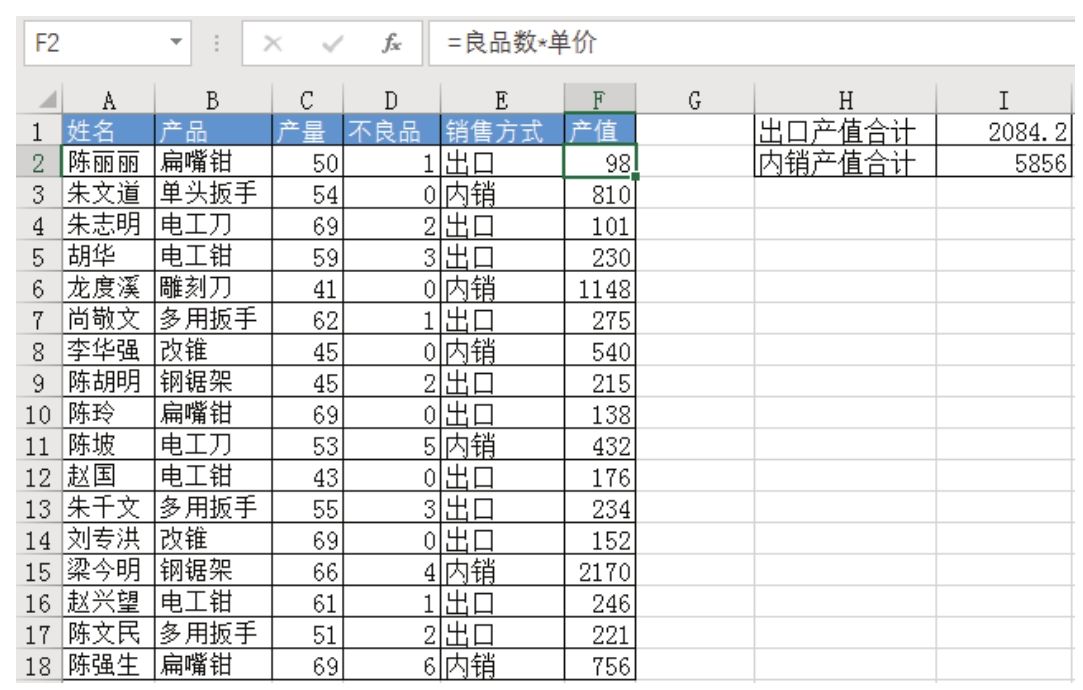 例如,在图7.93~图7.95所示的案例中,需要在F列根据内销单价和出口单价计算产值,其公式如下: