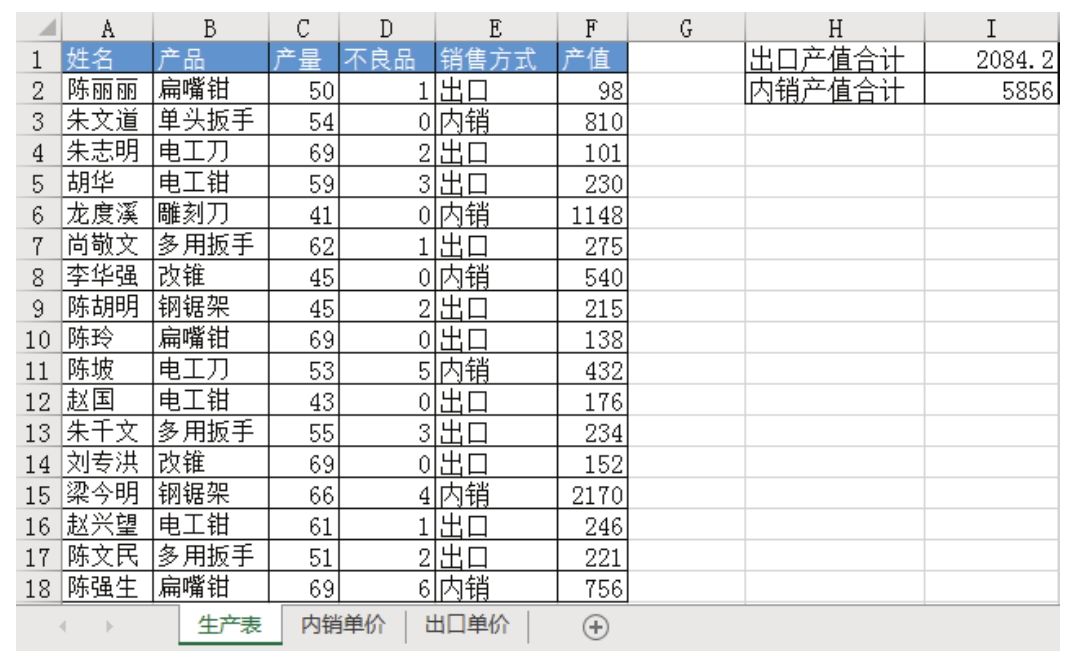 I1和I2需要根据生产表的产量按出口和内销分别统计产值,两公式如下:
