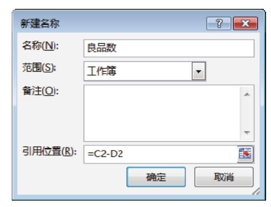 2.单击“新建”按钮,弹出“新建名称”对话框,然后将名称设置为“良品数”,将引用位置设置为公式“=C2-D2”,设置界面如图7.96所示。