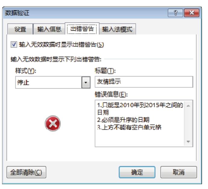 4.打开“数据验证”对话框的“出错警告”选项卡,“样式”保持“停止”不变,将“标题”设置为“友情提示”,将“错误信息”设置为“1.只能是2010年到2015年之间的日期2.必须是升序的日期3.上方不能有空白单元格”。图3.18和图3.19分别是设置公式与设置出错警告信息。