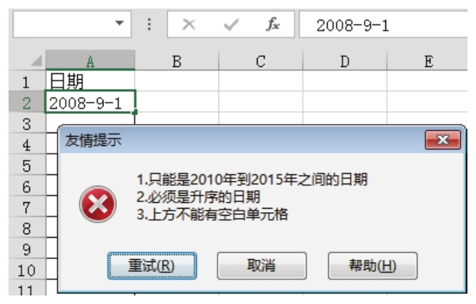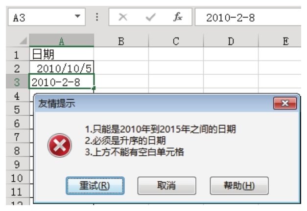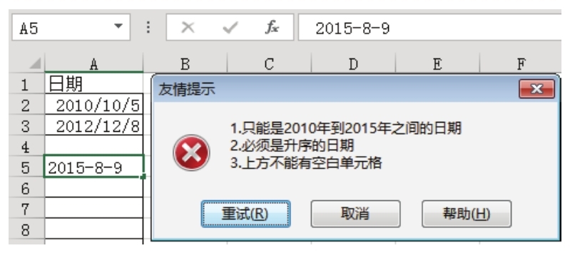 7.单击“重试”按钮,重新输入日期“2010-10-5”,由于此日期符合所有要求,因此Excel允许正常输入。