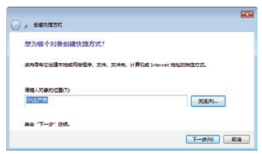 2.在“创建快捷方式”对话框中单击“浏览”,找到“D:\生产表”后双击打开,从而指定要创建快捷方式的文件夹路径,界面如图4.278所示。