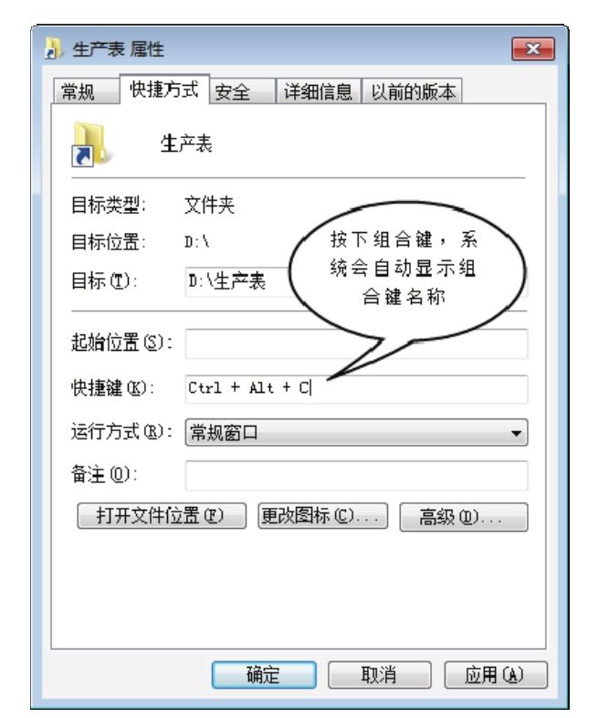 6.单击“确定”按钮保存设置,然后在桌面按下组合键<Ctrl+Alt+C>,此时 Windows会自动打开对应的文件夹“D:\生产表”。