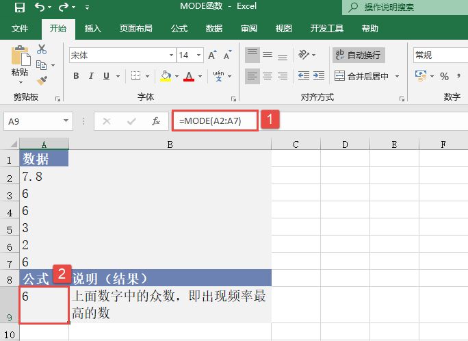 选中A9单元格,在编辑栏中输入公式“=MODE(A2:A7)”,用于计算上面数字中的众数,即出现频率最高的数,输入完成后按“Enter”键返回计算结果,如图18-38所示。