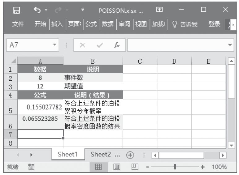 步骤2:在单元格A5中输入公式“=POISSON(A2,A3,TRUE)”,用于计算符合上述条件的泊松累积分布概率。