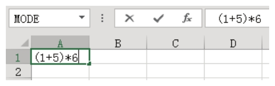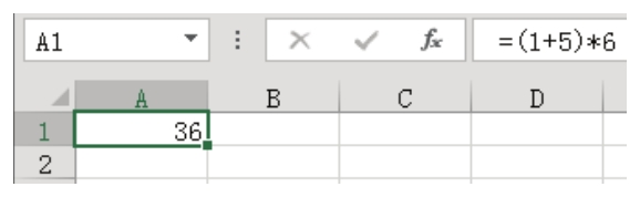 3.单击“确定”按钮返回工作表界面,然后在 A1 单元格中输入数学表达式“(1+5)*6”,当单击Enter键后表达式会自动转换成计算结果,但是同时在公式栏仍然可以看到表达式本身。图4.215是输入表达式时的状态,图4.216则是按下Enter键后的状态。
