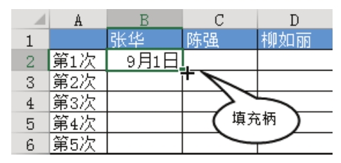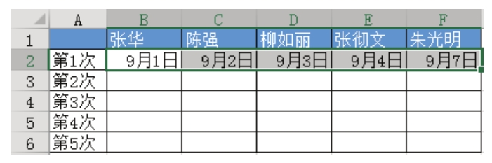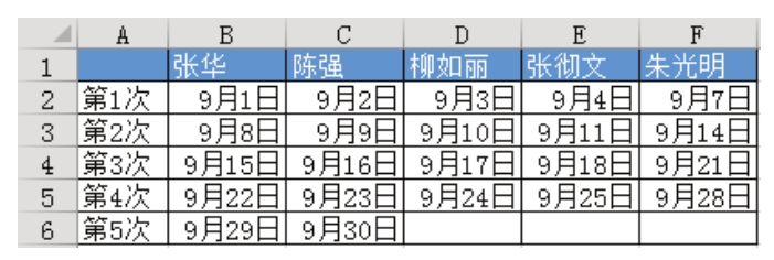 假设今天是2015年9月1日,要求对图4.178所示表格中的5个职员安排9月值日表,每人值日一天后轮到下一人,自动跳过周末。有什么办法快捷完成而非手工写入日期呢?