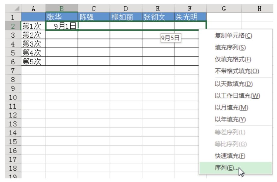 2.将鼠标指针移到 B2 单元格的右下角,当产生图 4.179 所示的黑色十字光标时按下右键拖动,当拖到F5时再松开鼠标,此时会弹出图4.180所示的右键菜单,单击“序列”菜单,弹出“序列”对话框。