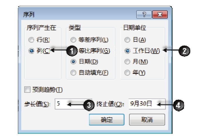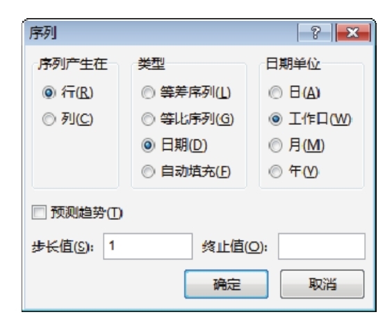 3.在“序列”对话框中将日期单位设置为“工作日”,步长值则采用默认值1,然后单击“确定”按钮执行填充操作。图4.181为设置填充方式的界面,而图4.182则是填充效果。