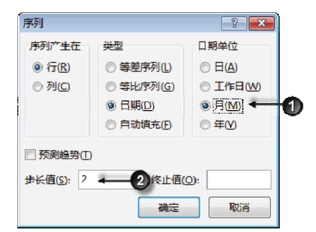 3.在对话框中将“日期单位”设置为“月”,将步长值设置为2,表示隔两个月生成日期。设置界面如图4.186所示,而填充结果如图4.187所示。