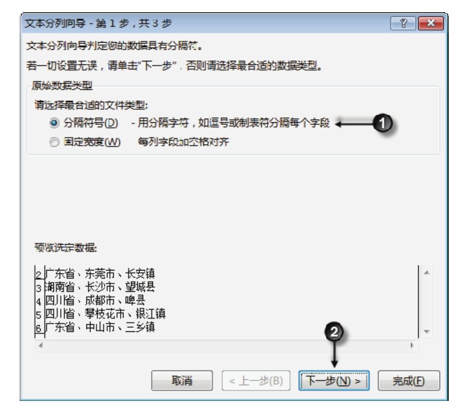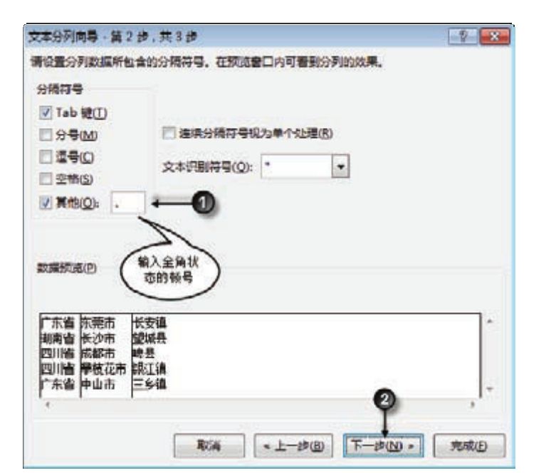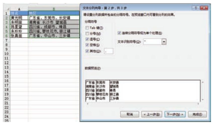 3.Excel 允许使用单条件对文本分列,也可以使用多条件分列。例如,在图 4.44 中,地区名称中既有全角顿号又有半角逗号和半角空格作为分隔符,只要在“文本分列向导”中设置正确即可一次性分列成功。