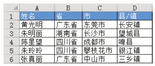 5.在B1:C1区域写入标题省、市、县/镇,然后对A1:D4区域添加边框,最终的地区表效果如图4.43所示。