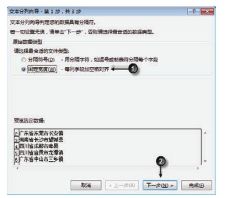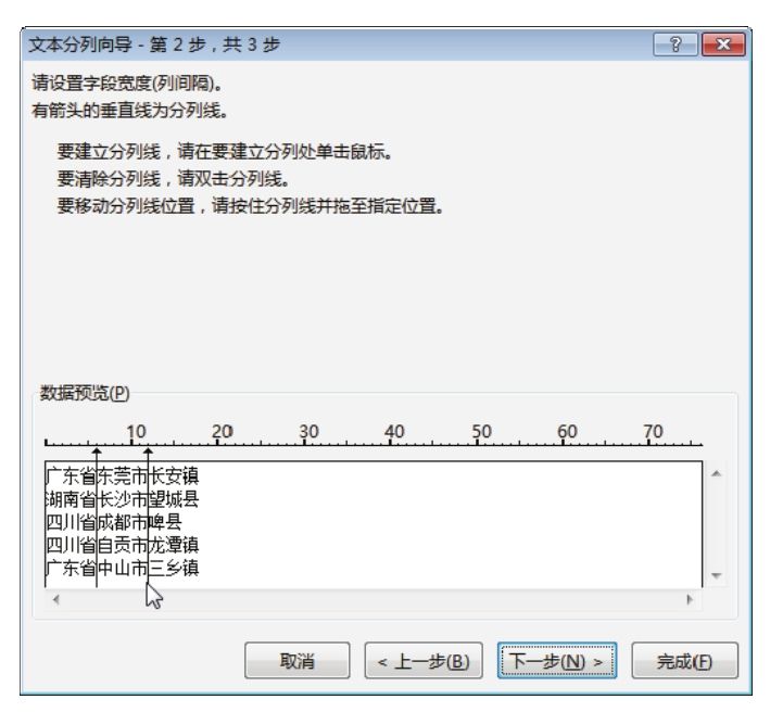 4.假设市名和省名都是3个字,那么可以按长度分列。例如,对图4.45所示的数据分列,可以在“文本分列向导”的第①步时按图4.46所示的方式设置分列选项。