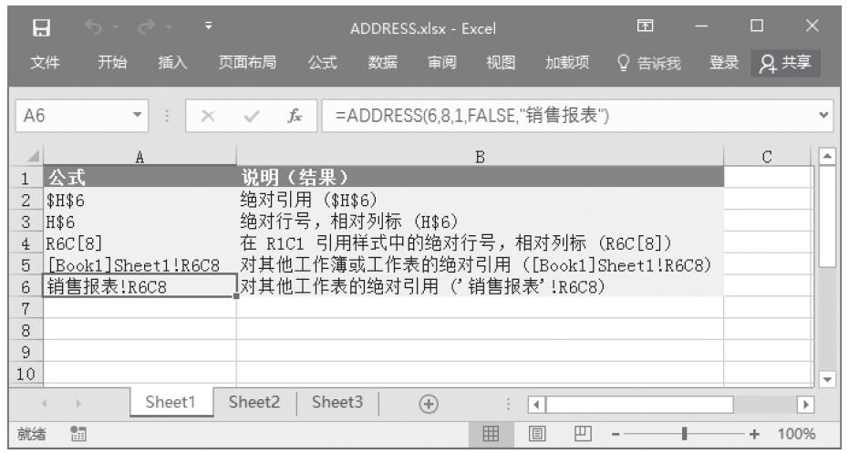 步骤5:在A6单元格中输入公式“=ADDRESS(6,8,1,FALSE,”销售报表”)”,用于返回对其他工作表的绝对引用(’销售报表’!R6C8)。计算结果如图15-2所示。