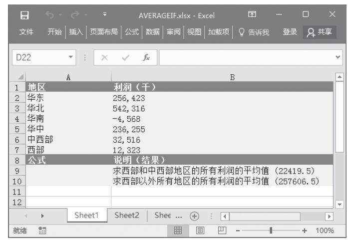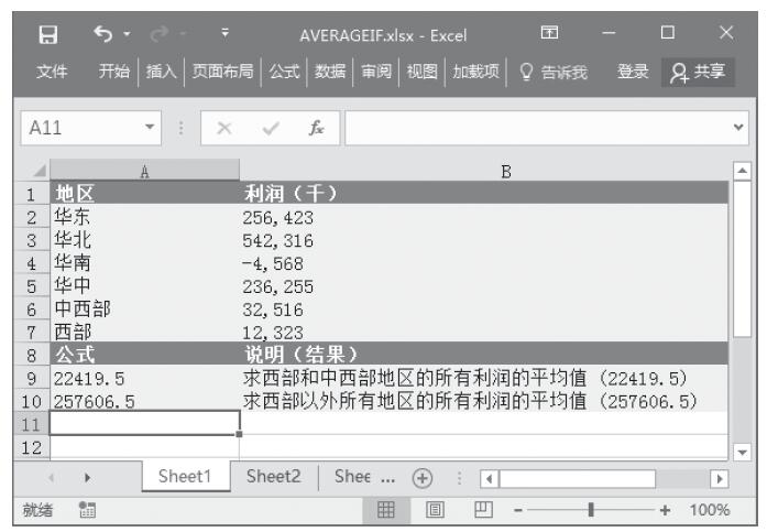 步骤3:在单元格A9中输入公式“=AVERAGEIF(A2:A7,”<>*西部”,B2:B7)”,用于计算西部以外所有地区的利润的平均值。计算结果如图16-8所示。