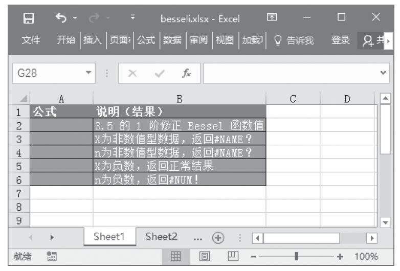 步骤5:在单元格A6中输入公式“=BESSELI(3.5,-1)”,用于求解n为负数时的修正Bessel函数值,可以看到返回结果为“#NUM!”。最终计算结果如图18-32所示。