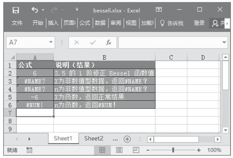 【使用指南】如果x为非数值型,则BESSELI返回错误值“#VALUE!”;如果n为非数值型,则BESSELI返回错误值“#VALUE!”;如果n<0,则BESSELI返回错误值“#NUM!”。