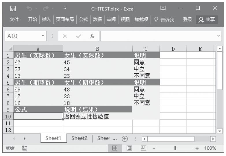 【典型案例】某班统计本班中男生与女生去某地旅游的意向,已知统计的实际数值与期望数值,计算相关性检验值。基础数据如图16-27所示。