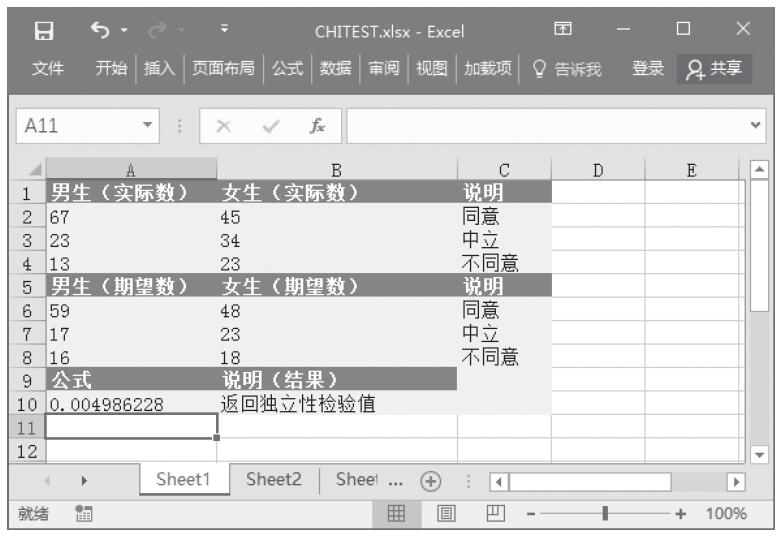 步骤2:在单元格A10中输入公式“=CHITEST(A2:B4,A6:B8)”,用于计算总体平均值的置信区间。计算结果如图16-28所示。