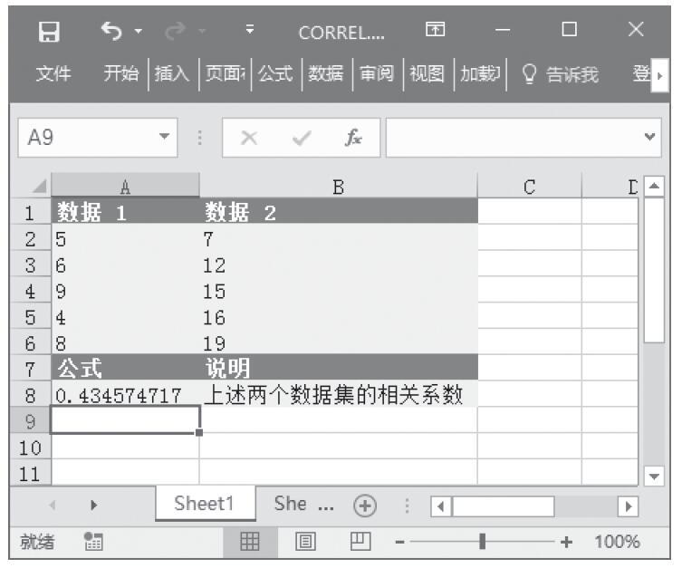 步骤2:在单元格A8中输入公式“=CORREL(A2:A6,B2:B6)”,用于计算两个数据集的相关系数。计算结果如图16-124所示。
