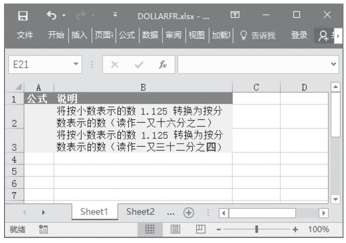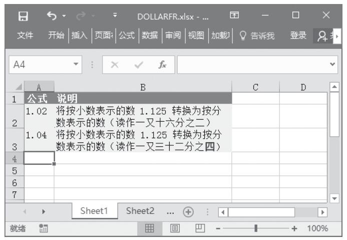 步骤2:在单元格A2中输入公式“=DOLLARFR(1.125,16)”,用于将按小数表示的数1.3转换为按分数表示的数(读作一又十六分之二)。