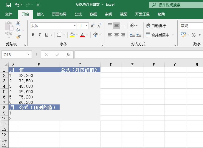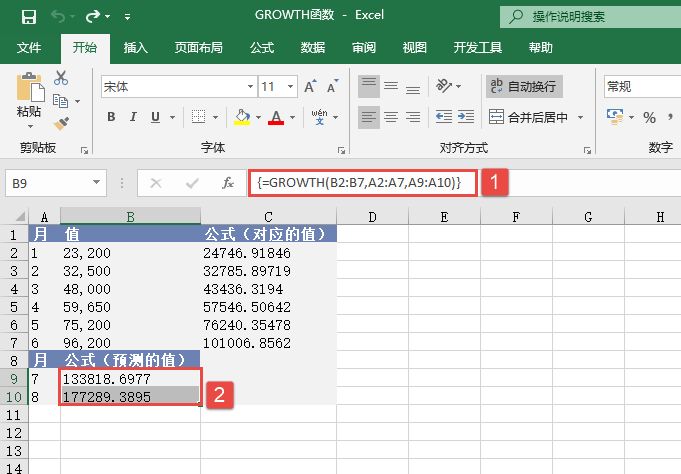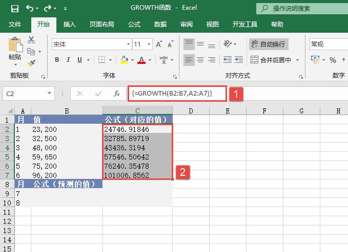 步骤2:选中“C2:C7”单元格,按F2键,输入公式“=GROWTH(B2:B7,A2:A7)”,然后按“Ctrl+Shift+Enter”组合键以数组公式输入。