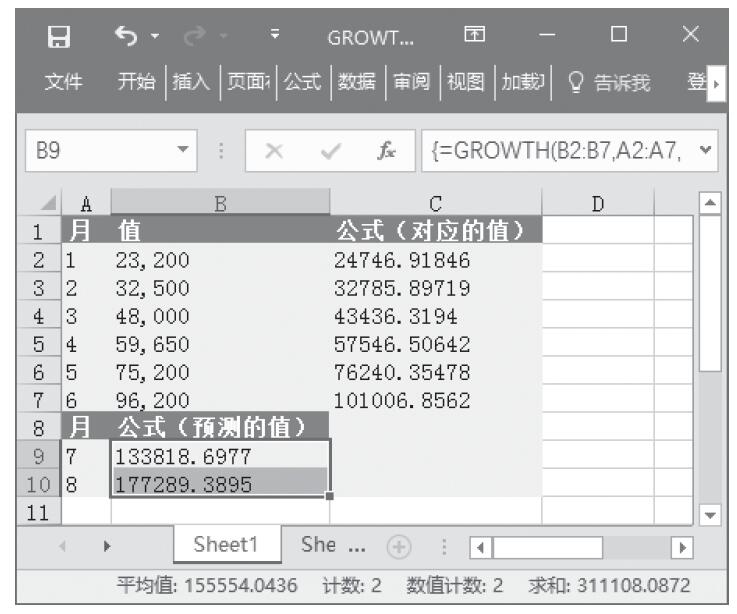 步骤3:选中“A9:A10”单元格,按F2键,输入公式“=GROWTH(B2:B7,A2:A7,A9:A10)”,然后按“Ctrl+Shift+Enter”组合键以数组公式输入。计算结果如图16-62所示。