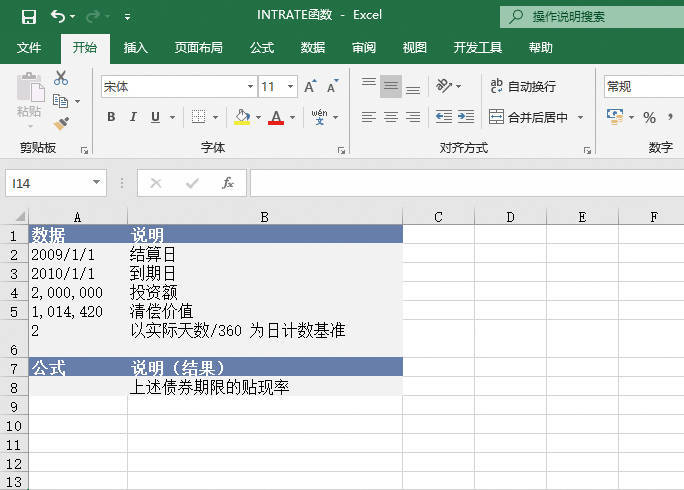 INTRATE函数用于计算一次性付息证券的利率。INTRATE函数的语法如下: