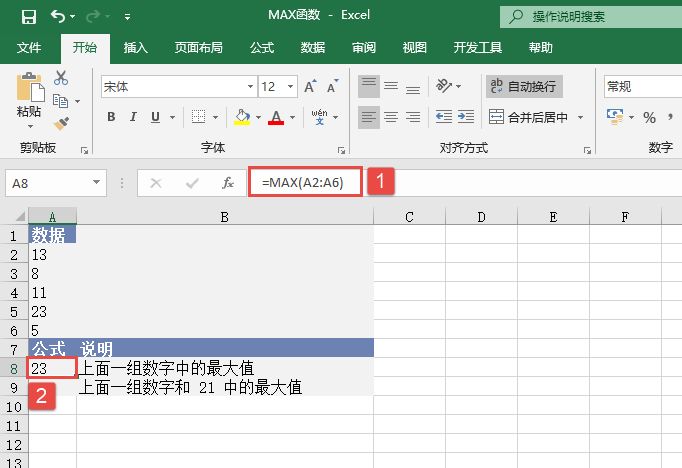 步骤2:在单元格A8中输入公式“=MAX(A2:A6)”,用于计算上面一组数字中的最大值。