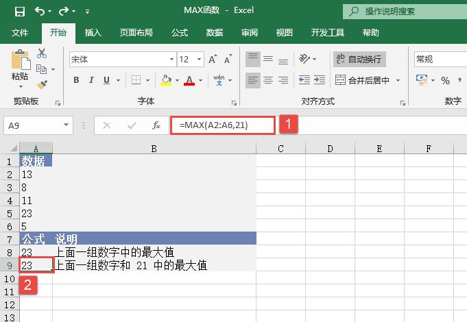 步骤3:在单元格A9中输入公式“=MAX(A2:A6,21)”,用于计算上面一组数字和21中的最大值。计算结果如图16-72所示。