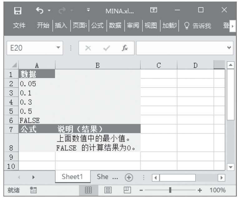 包含TRUE的参数作为1来计算,包含文本或FALSE的参数作为0(零)来计算。如果参数为错误值或不能转换为数字的文本,将会导致错误;如果参数不包含任何值,函数MINA返回0;如果要使计算不包括引用中的逻辑值和代表数字的文本,则需要使用MIN函数。