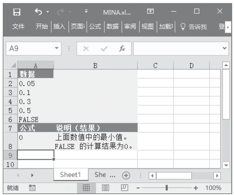 步骤2:在单元格A8中输入公式“=MINA(A3:A6)”,用于计算上面数值中的最小值(FALSE的计算结果为0)。计算结果如图16-80所示。