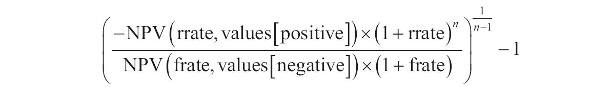 函数MIRR根据输入值的次序来解释现金流的次序。所以,务必按照实际的顺序输入支出和收入数额,并使用正确的正负号(现金流入用正值,现金流出用负值)。如果现金流的次数为n,finance_rate为frate而reinvest_rate为rrate,则函数MIRR的计算公式为: