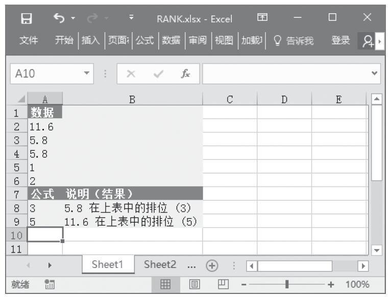 步骤3:在单元格A9中输入公式“=RANK(A2,A2:A6,1)”,用于计算11.6在上表中的排位。计算结果如图16-132所示。