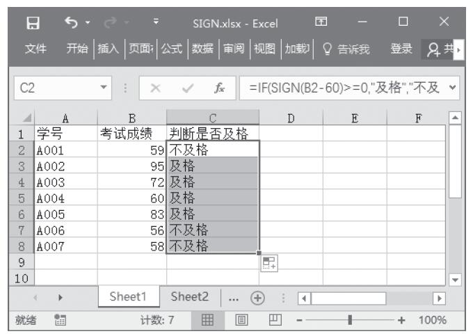 在C2单元格中输入公式“=IF(SIGN(B2-60)>=0,”及格”,”不及格”)”,判断学号为A001的同学成绩是否及格,然后使用自动填充功能来判断其他同学的成绩是否及格,如图13-71所示。