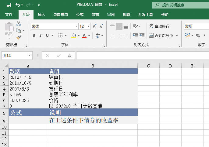 YIELDMAT函数用于计算到期付息的有价证券的年收益率。YIELDMAT函数的语法如下。