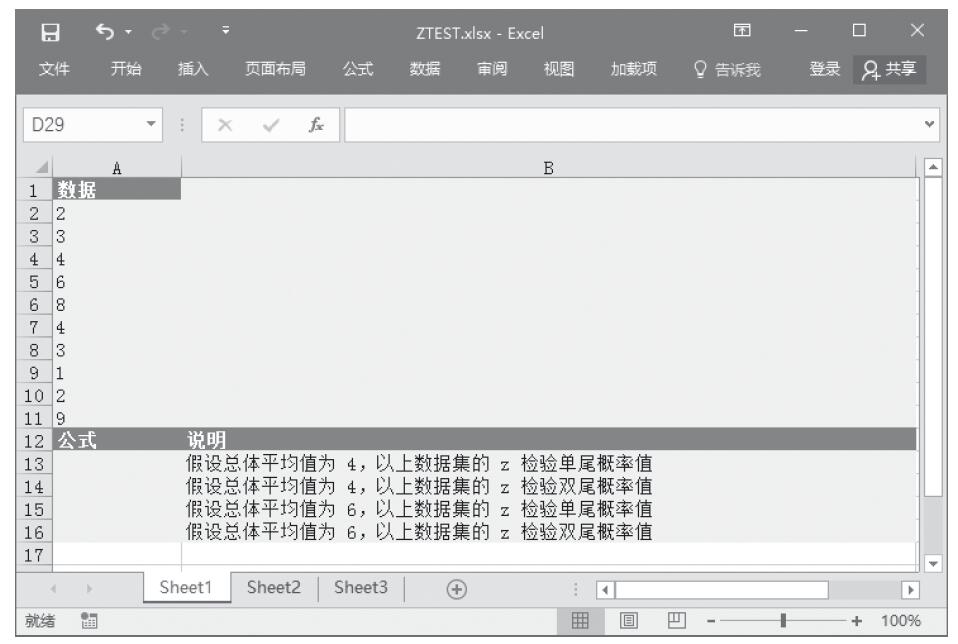【典型案例】已知一组数据,计算z检验的单尾概率值。基础数据如图16-45所示。