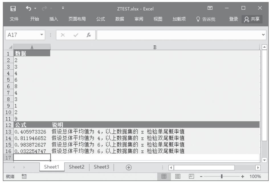 步骤5:在单元格A16中输入公式“=2*MIN(ZTEST(A2:A11,6),1-ZTEST(A2:A11,6))”,用于计算假设总体平均值为6,以上数据集的z检验双尾概率值。计算结果如图16-46所示。