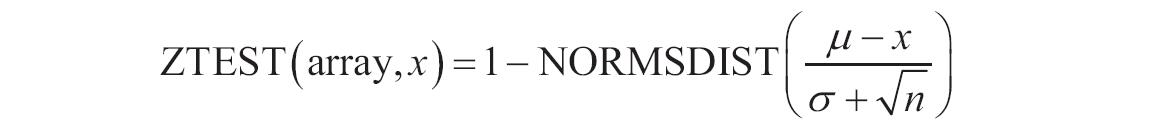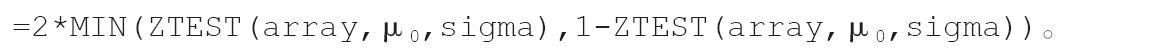 当基础总体平均值为μ0,样本平均值从μ0(沿任一方向)变化到AVERAGE(array)时,下面的Excel公式可用于计算双尾概率。